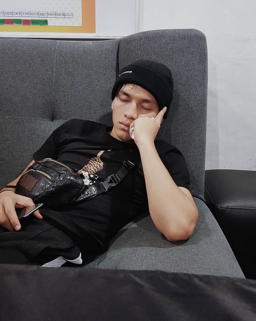 Aktor berusia 21 tahun ini memperlihatkan foto duduk .